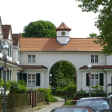 Der Sonntag war mir in der Stadt schon fast zuuu warm und schwül. Ich hatte mir in den Kopf gesetzt, einen Ausflug nach Kladow zu machen. Da ich aber vormittags noch etwas fertig machen wollte und abends mein Lieblingstanzen im Café Fatal auf dem Programm stand, reichte die Zeit nur für eine kleinere Tour. Ich habe mich trotzdem auf den Weg nach Pichelsberg gemacht. Die Bocksfeldsiedlung auf dem Weg (1927-1930 erbaut, Architekt: Carl Jakobs) ließ mein Architektinnenherz höher schlagen.