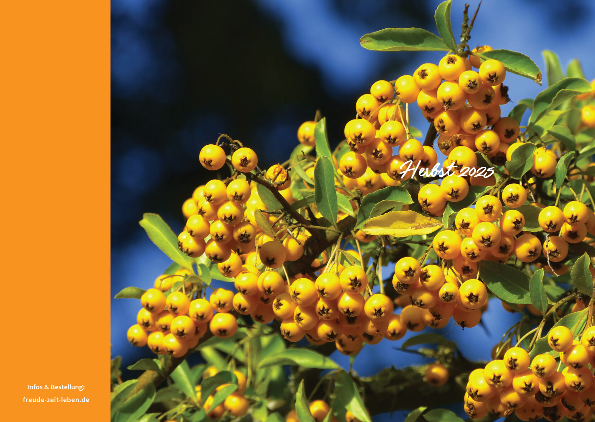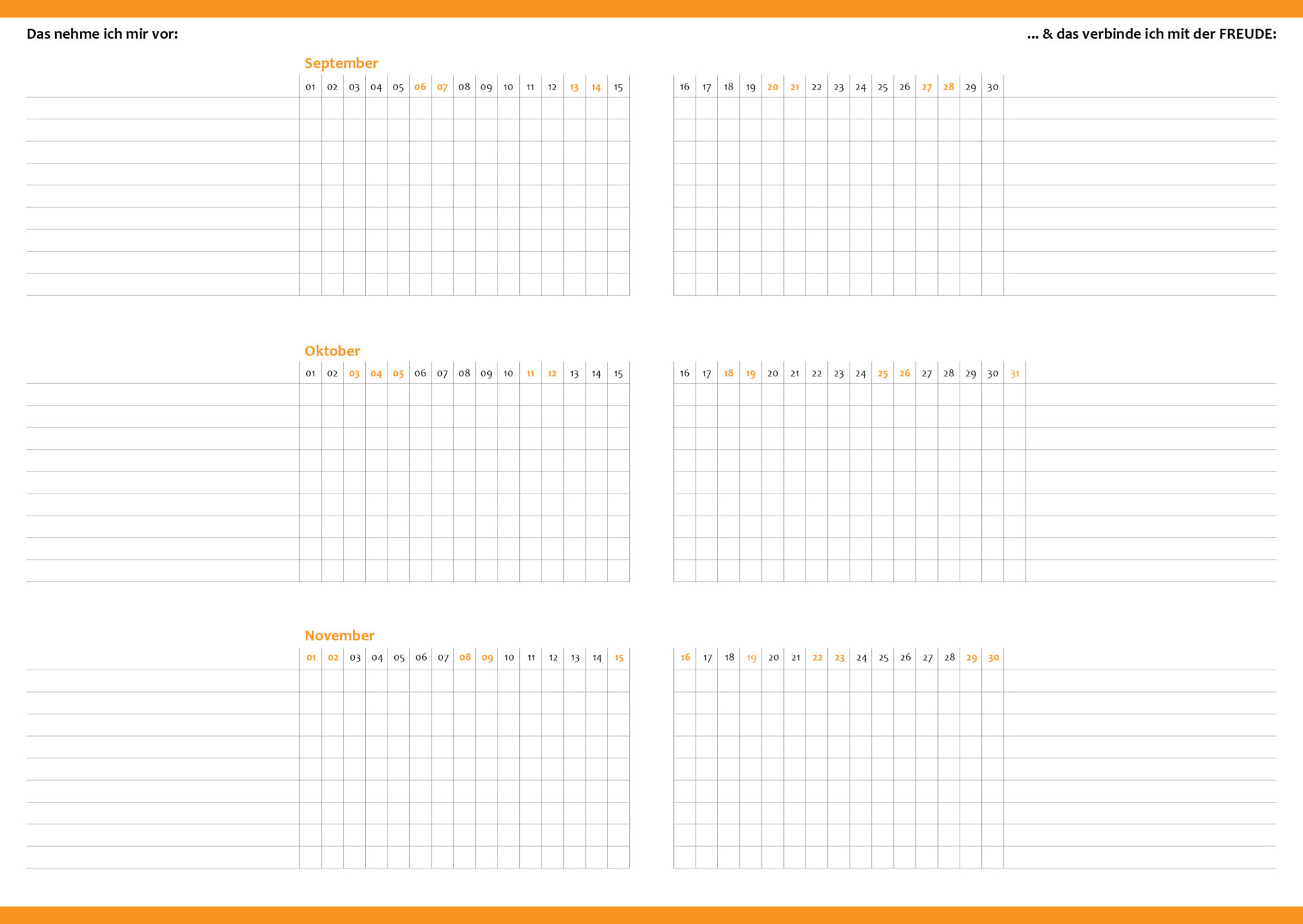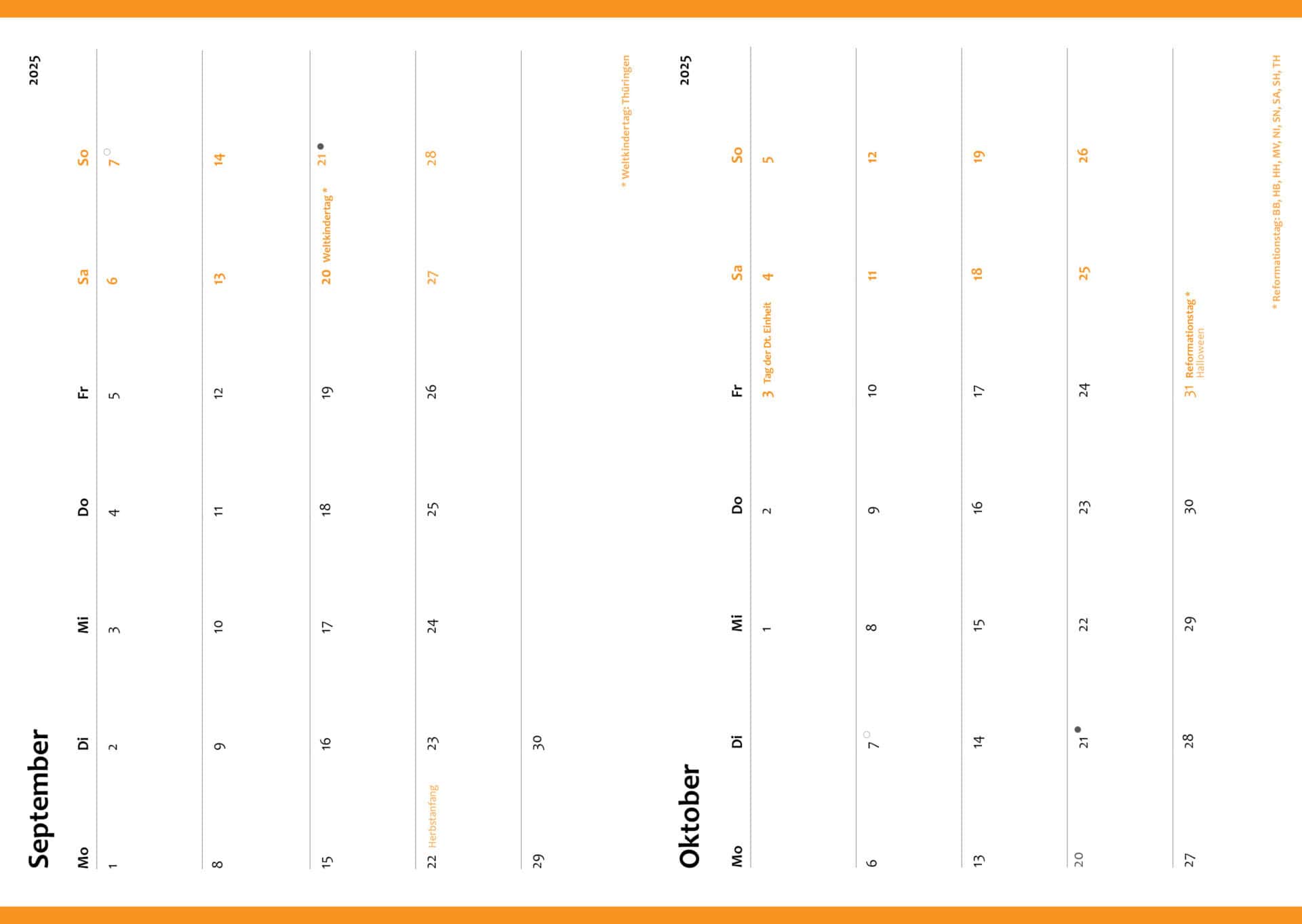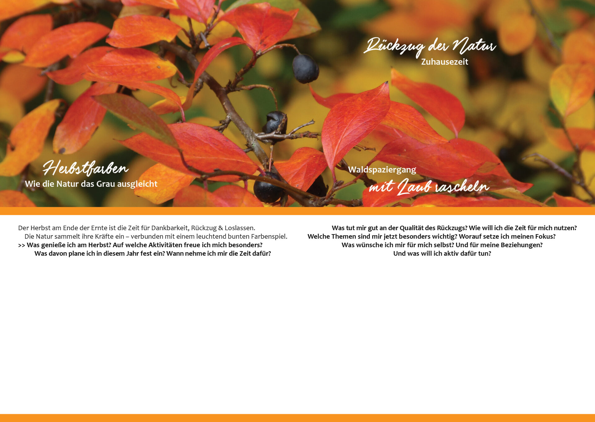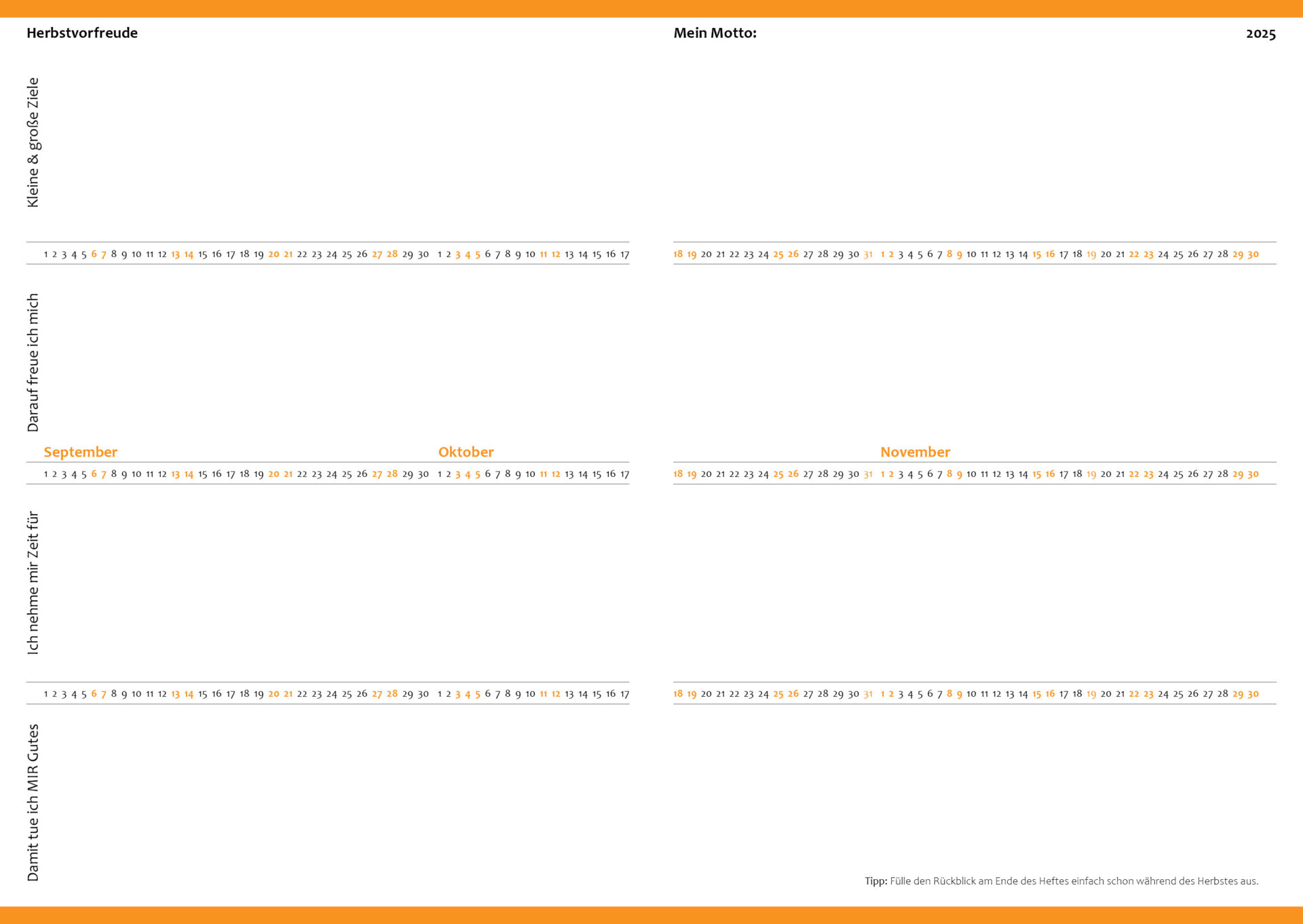 Ein Heft “Herbst 2025” (52 Seiten) in warmem Orange mit Kalendarium für September bis November 2025 und “Jahreszeitenreflexion Herbst”. Je Kalenderwoche eine Doppelseite, datiert.